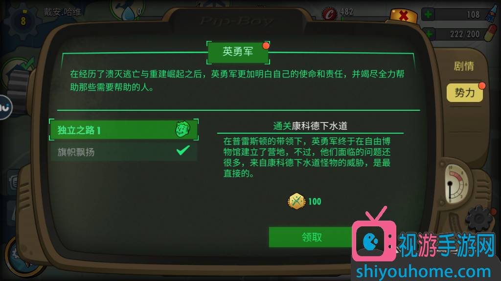回到避难所之后再次进入任务界面,进入势力任务栏,这里提交任务之后就能获得任务的最终奖励,势力的势力勋章。需要注意的是势力任务是有限制的,如果刷出势力任务一定要及时完成。