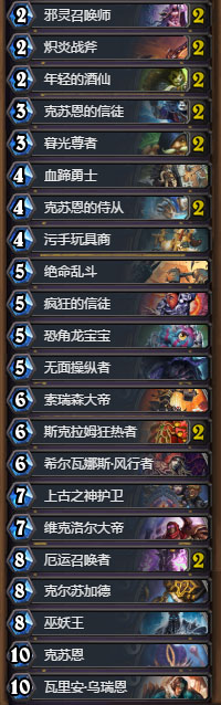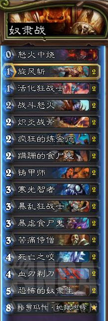 这套卡组的核心在于暴乱狂战士,暴乱的狂战士拥有很强的成长能力,加上奴隶主的铺场,可以快速的把攻击力堆上去。
