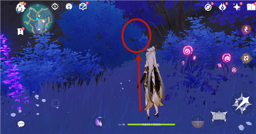 走到两朵发光的红花这里,视角往左拉,朝着秘境的方向,会看到一个隐蔽的洞口,往前走进去。