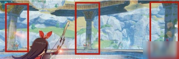 在飞过来的时候可以看见六个火柱分别环绕在圆圈周围。只需要对着三个残破柱子下面的火柱,按照柱子横向长度由短到长点亮柱子,这样谜题就解开了,下面区域的封印也会被破除。