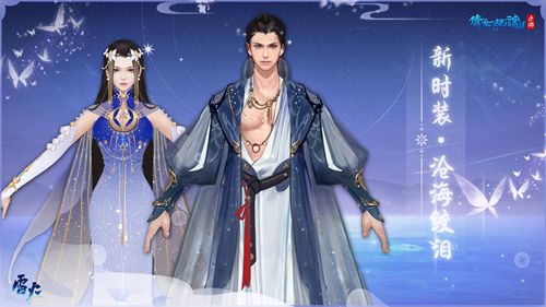 新时装——沧海鲛泪以蓝白为主色调,设计灵感源于蚌珠与鲛人。鲛人,又名泉客,善于纺织,可以制出入水不湿的龙绡,且滴泪成珠。时装上随处可见的珍珠等各类海洋元素,搭上蓝白的底色,充满了梦幻色彩。