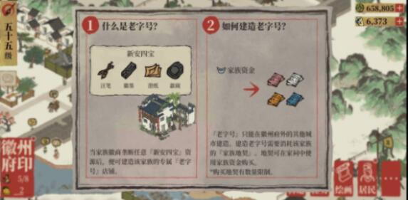 达成垄断条件之后在【营造】-【娱乐】中就能够找到对应的老字号,建造老字号需要已经垄断该资源的家族的地契,0点刷新,2万家族资金/张,每个家族限购20张,每次建老字号需要5张地契,每天只能买一张。