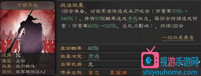 战法效果:这是属于弓兵专属的战法,满级情况下,战法触发几率是40%,需要1回合准备,对敌军全体造成兵刃攻击(140%),并有50%概率造成溃逃状态,每回合持续造成伤害(伤害率120%,受武力影响),持续1回合!