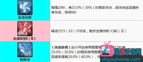 烟雾弹:战斗开始使用烟雾弹,随后每15秒有15.0%(30.0%)的概率使用烟雾弹,处于烟幕中的先锋部队回避率提高20.0%(40.0%),持续5秒,同技能效果不叠加。