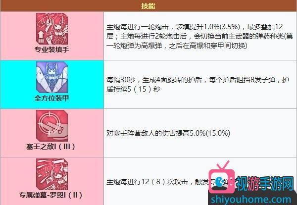 生存顶尖、输出优质的强力前排,护盾(含预装填)特化,在盾拐中拥有最高的盾量且稳定。双主炮配技能,dps和平滑度都不错;弹幕dps高(伤害和长时战斗触发次数都较可观)。主炮为强制高爆与穿甲切换有限制(与路易一同在弹种泛用性上存在问题),但处理复杂环境又相当不错。