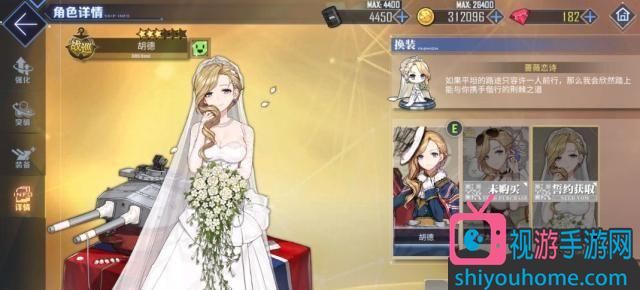 突破升星效果:一阶时可以使主炮底座增加1和主炮效率提高5%;二阶时可以使得副炮底座增加2并使得主炮效率提升10%;三阶时可以使得主炮底座增加1和主炮效率提升10%。技能:皇家舰队的荣耀,在自身的主炮开火时,自身有一定的概率(40%~70%)可以向前方发射一轮专属弹幕,威力随着技能等级的提高会有所提升,并且使得己方所有的主力舰队角色的装填提高20%~40%,效果可以持续8秒钟。自身拥有2套皮肤,分别是照耀太阳的淑女和蔷薇恋诗,蔷薇恋诗中胡德身着白色的婚纱,嘴角有着迷之微笑,那是真的好看。