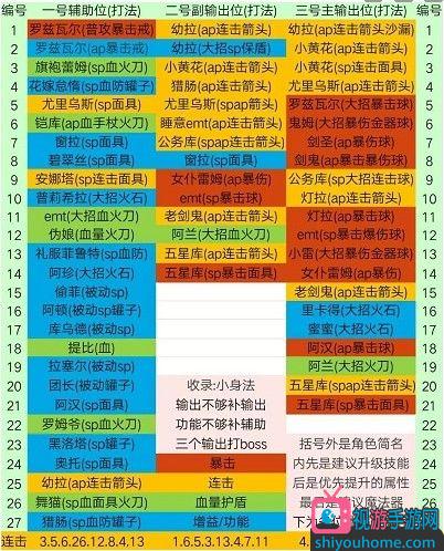 数字是对应位置的编号,队伍中数字的排序为小编认为适合担当队伍该位置的推荐度。