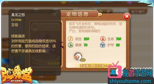 飞天龙:主动技能【真龙之怒】,对所有敌方造成自身攻击120%的伤害,使用后回合结束,该伤害不受道具加成影响。