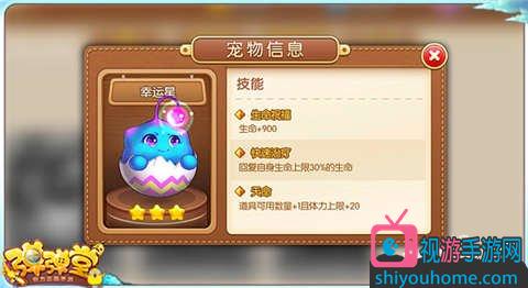 宠物点评:幸运星是肉肉的加强版,除了可以加强我们的生命属性以外,还能让我们在道具方面取得优势,加强了我们战斗的多样性和策略性。