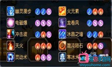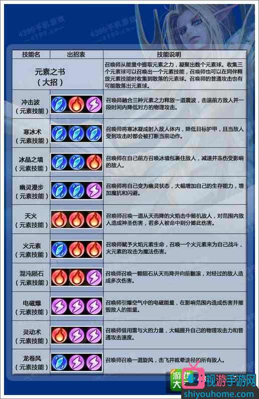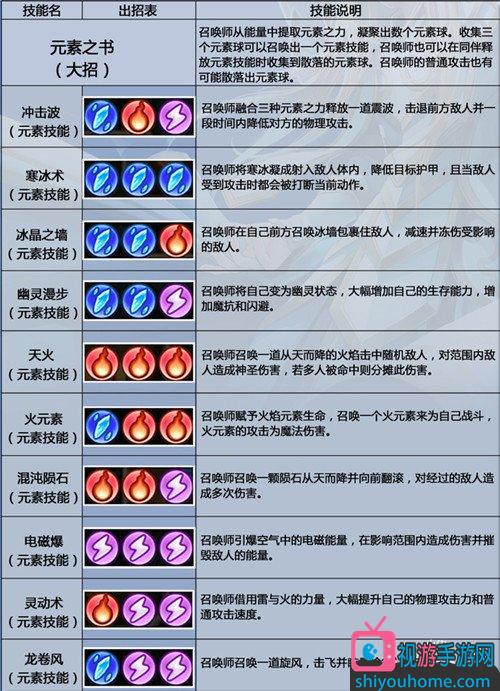 召唤师的大招“元素之书”会产出六个水、火、雷属性的元素球。收集到3个元素球即可施展元素技能,召唤师共有10个元素技能。