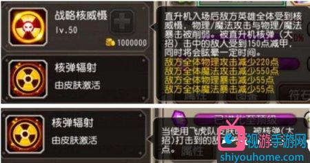 而皮肤技能和神器技能都是在大招核弹上增加减甲效果100+150=250点。另外神器技能还有一个减敌人(物220法550)攻击、减敌人(物55法55)暴击的光环,攻击减不了多少,但是减55的法术暴击就相当多了,一般法师的暴击都在200-600。这个光环直接减少了10%-20%,而对于物理单位上千的暴击就不多了。所以无论是直升机的皮肤还是神器技能,在当前来说最重要的就是利用好减甲,而只有大招才能附加这个效果,也就是大招能多打击到敌人就更有效果。