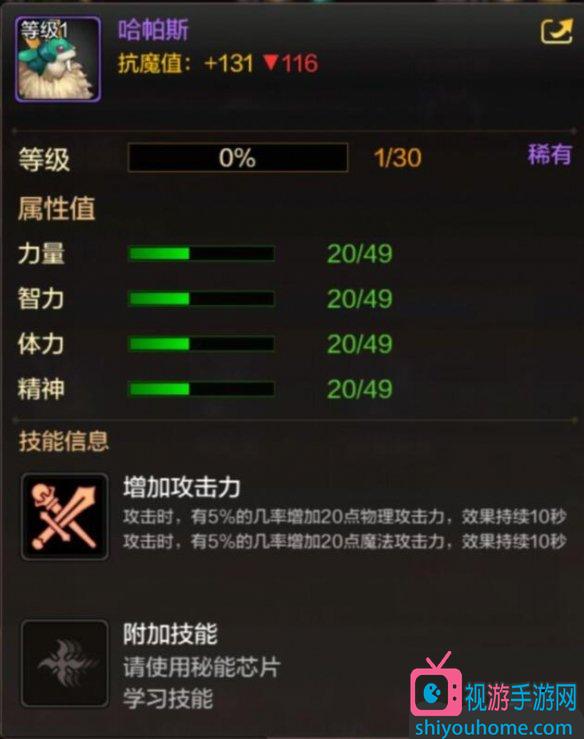增加攻击力:攻击时,有5%的几率增加20点物理攻击力和20点魔法攻击力,效果持续10秒。