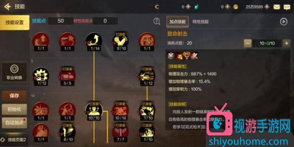 顾名思义能造成致命一击的一次射击。技能效果已经接近九倍的物理伤害了,并且还能增加15%的暴击率,这样要是我们把暴击率堆到85%左右的时候在使出这个技能,造成的伤害就是百分百暴击了,那就是18倍的伤害了,并且这个技能还是增加百分之百的穿刺力,基本就是一枪下去,对你面前所有的敌人都会造成伤害,是一项AOE伤害技能。
