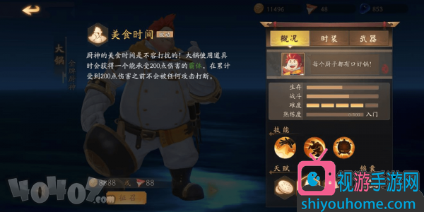 大锅:天赋美食时间谁都别打扰我吃东西(四排时可以化生肉盾一个200霸体状态,好厚实的肉盾),锦囊开小灶可以制作好多找不到的食物好嘴馋啊!(推荐大家烤一些使用的可以加永久的食物!)