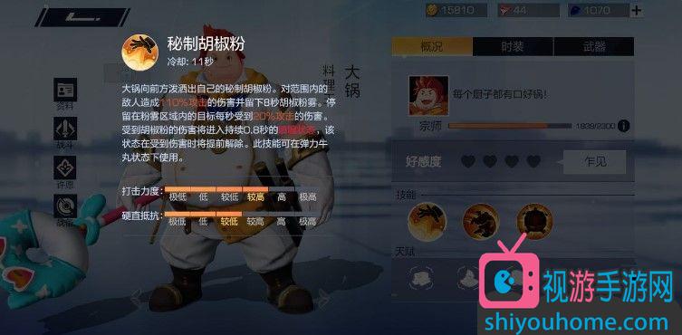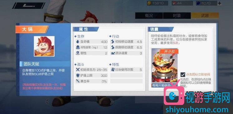 基础属性如下,普攻伤害前期不穿任何装备大概是6-18的伤害,特别低,后期也就40-60的伤害,韧性也不多移速较慢,跑毒很容易跑死。锦囊:开小灶,比一般的炉子厉害的多,缺点就是次数太少,所以背包会攒一些吃的不敢直接拿出来用,后期用的话容易被发现被打死,且敌人也会用你的炉子。