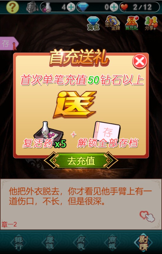 游戏首次充值需要消耗50钻石以上,可以获得复活药水*5,这相当于能够自动复活5次,可以解锁全部的剧情,直至通关。