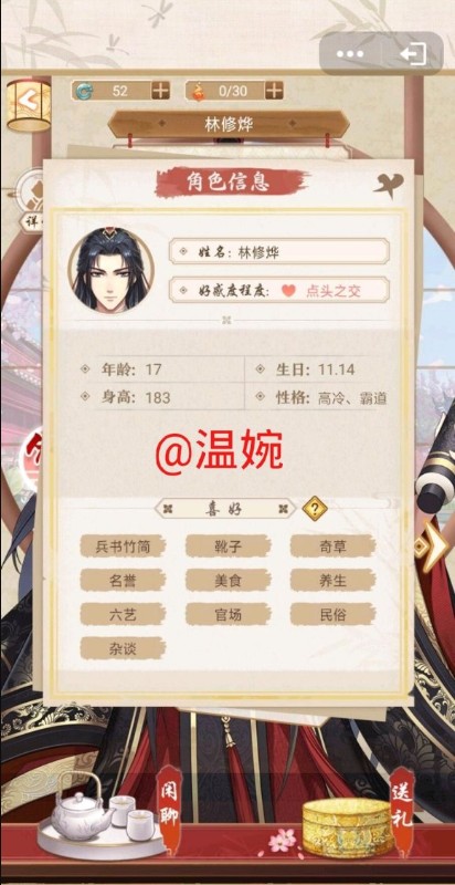 礼物:雨前龙井【20好感】,蹴球【100好感】,失传古籍【50好感】