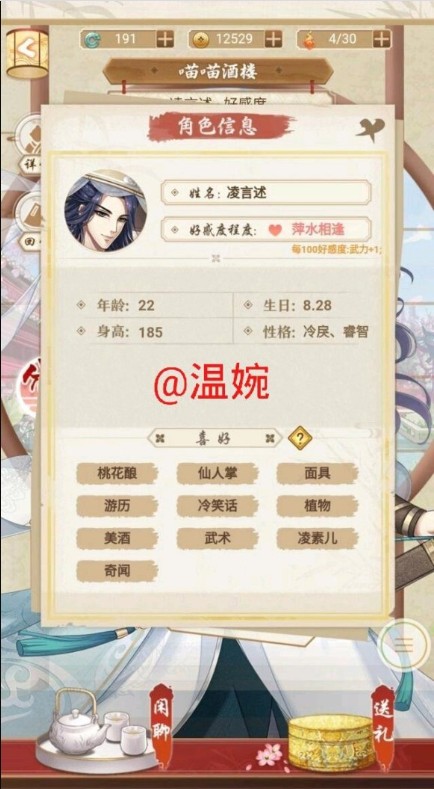 礼物:面具【20好感】,仙人掌【100好感】,桃花酿【50好感】