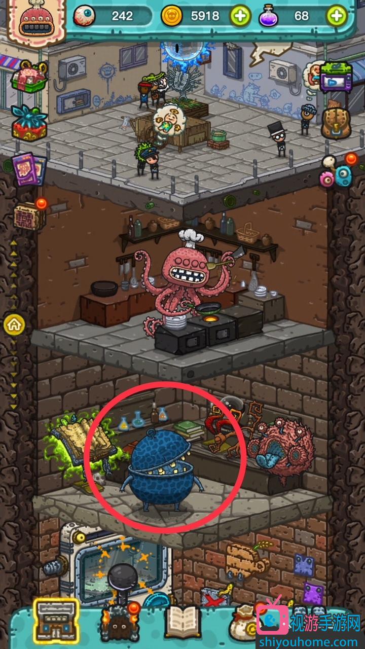 2、收集完必须的原材料后,来到游戏主界面地下二层,点击这个蓝色的、张大嘴的炉子。