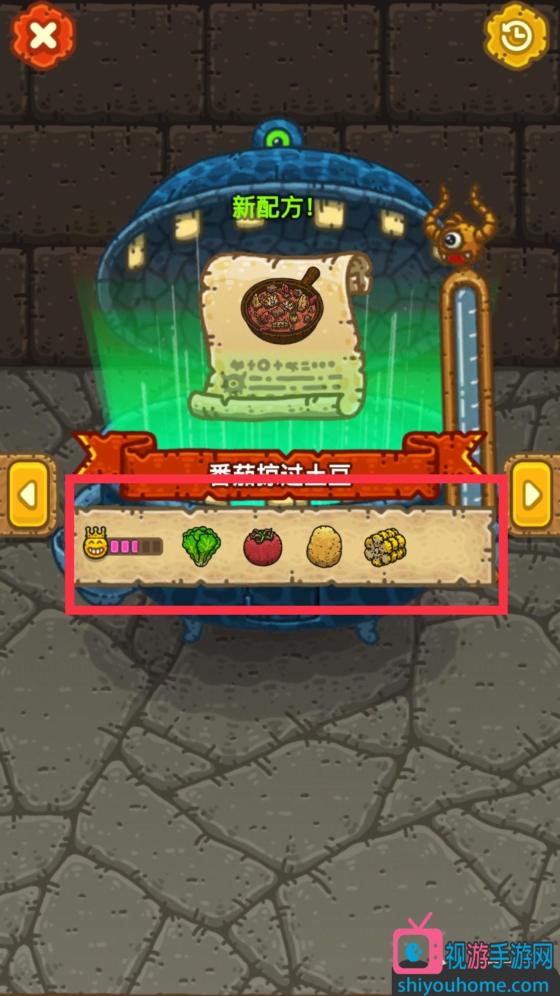 4、这道名字奇怪的料理的最佳料理方式,也就是所谓的“皇冠配方”的清单是:1颗生菜,1个番茄、1块马铃薯、1个玉米。其他我研究出的清单有1个番茄、2块马铃薯、1个玉米。