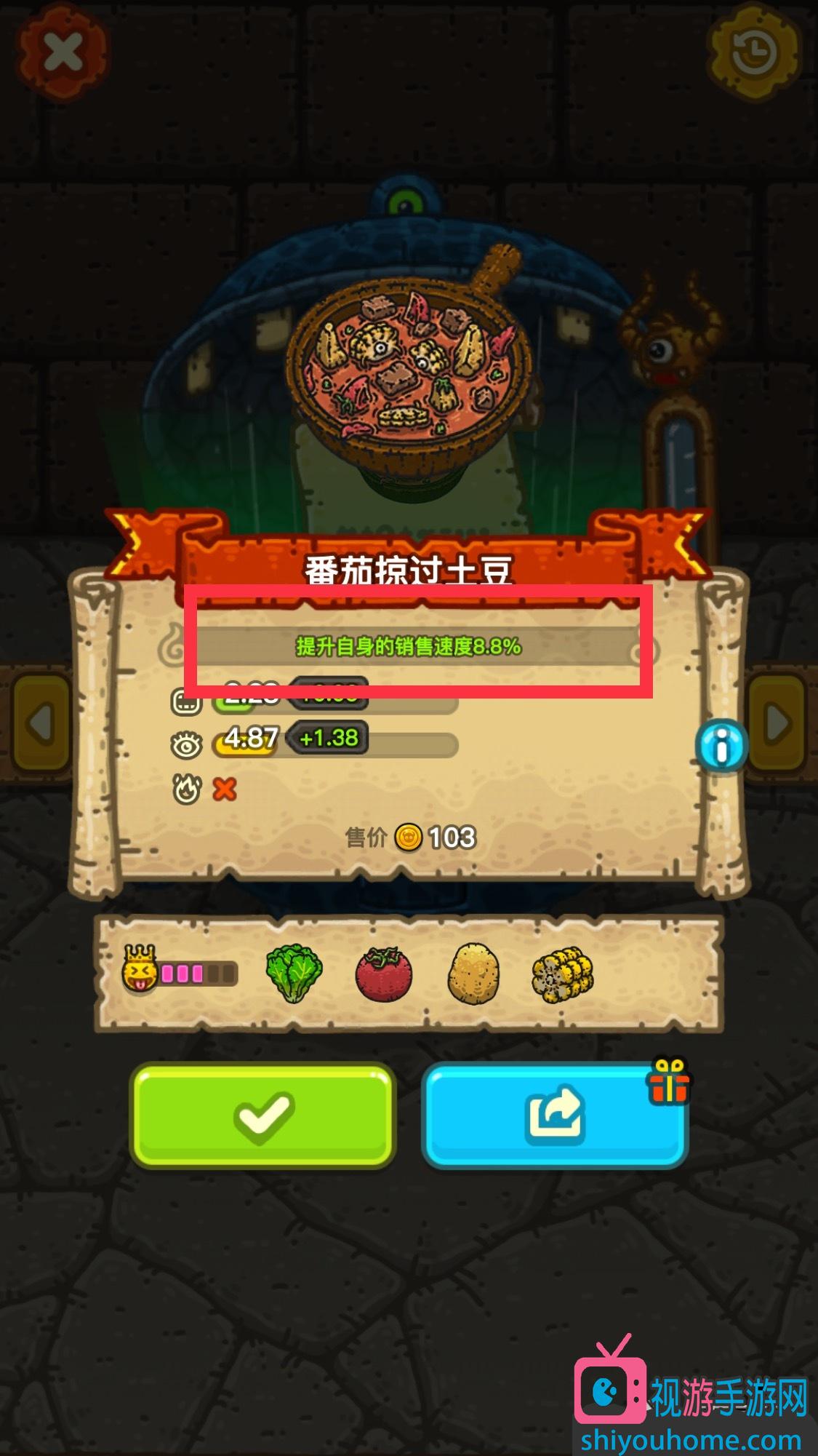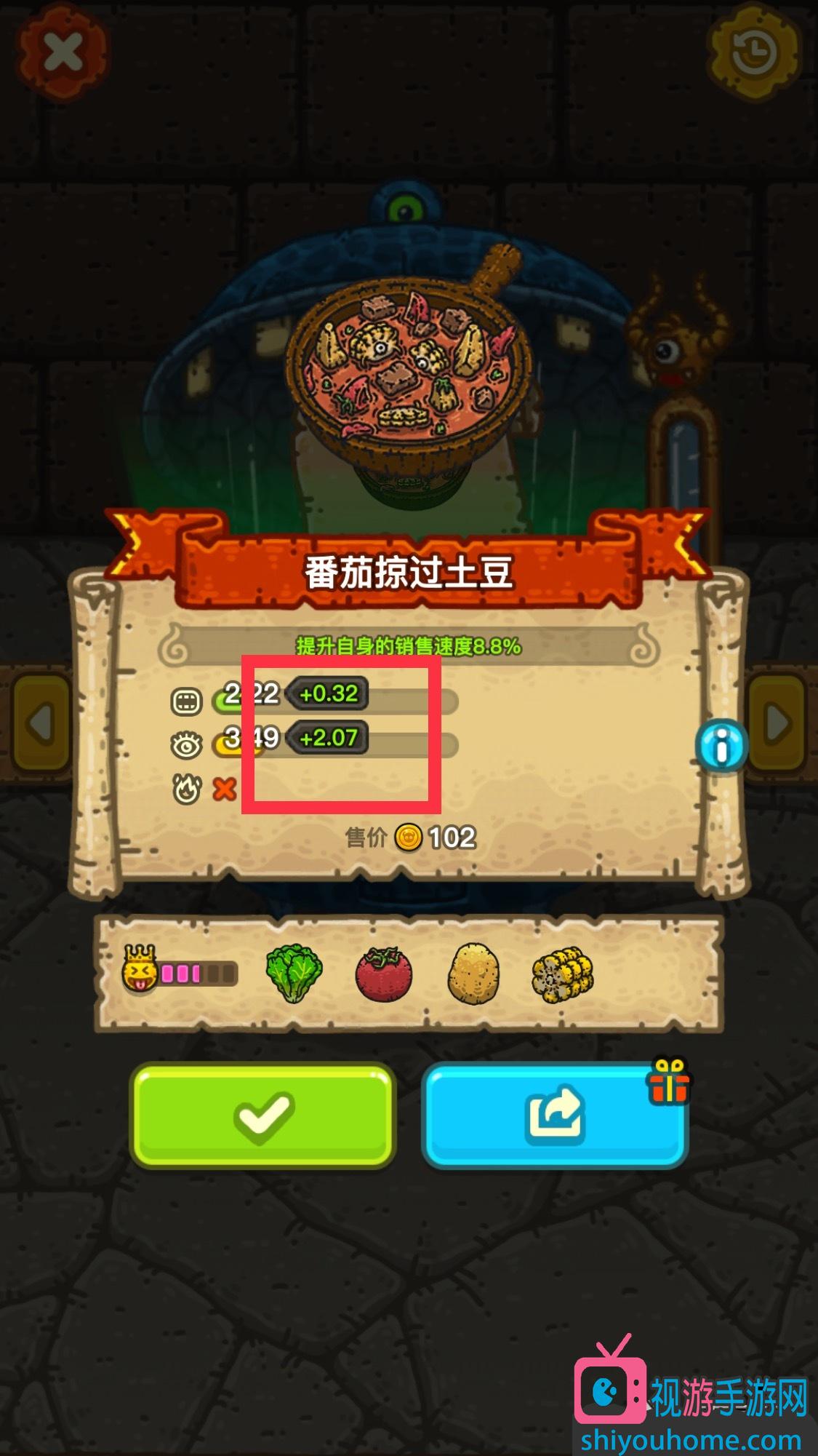 5、不同的配方,其收益、口感、美观度都不同,皇冠料理还会解锁额外的暗黑属性。这道菜的暗黑属性是提升自身销售速度,不同料理的暗黑属性不一致。