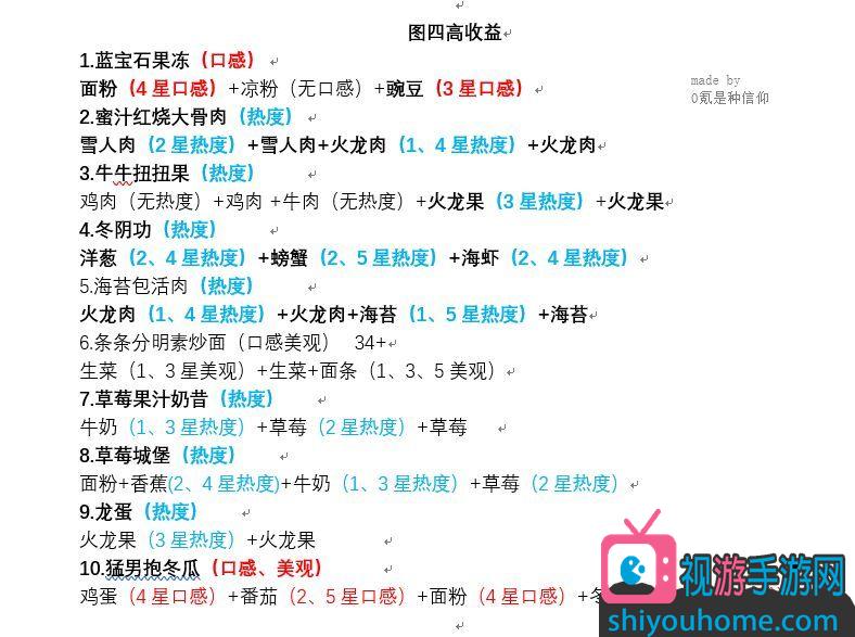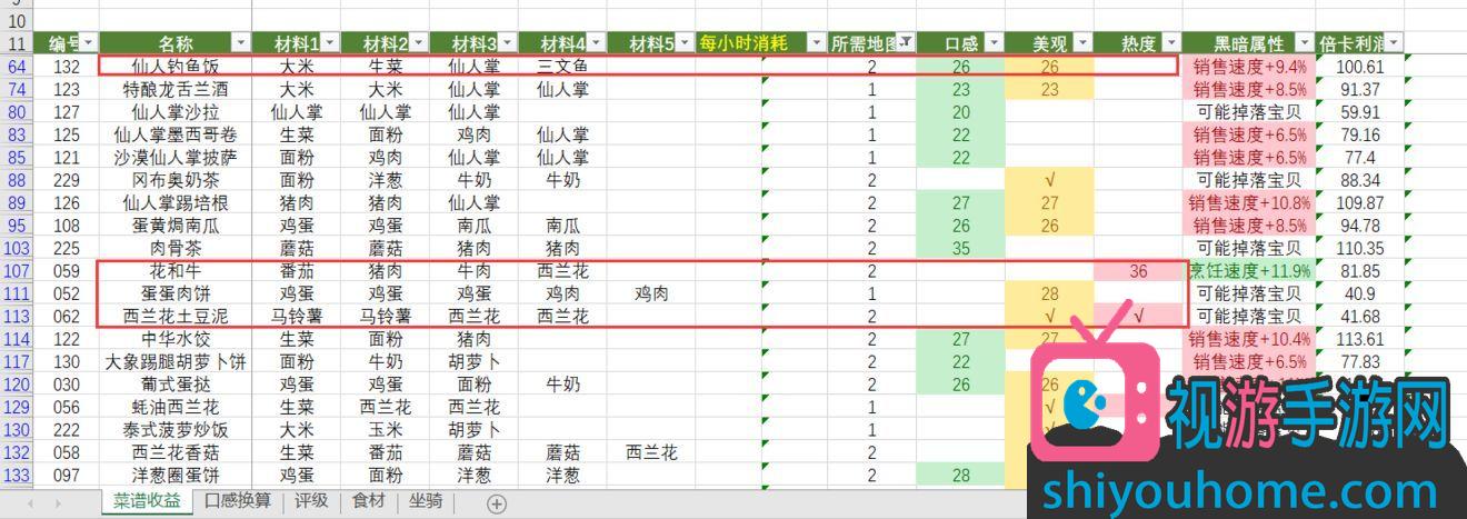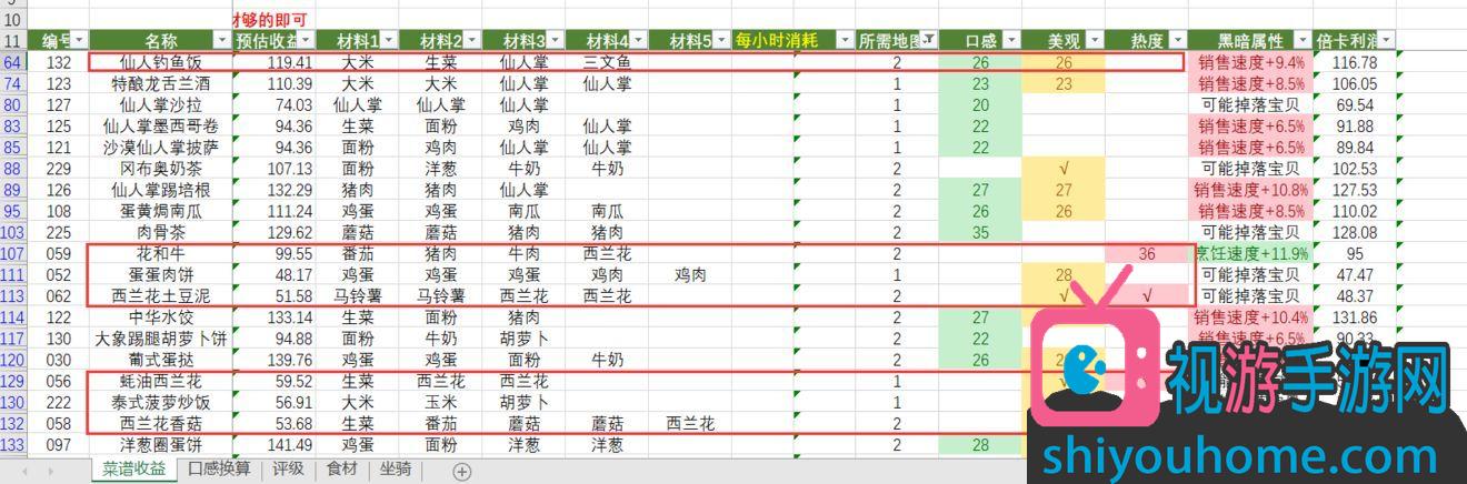 以下菜谱高收益/高售价都是从高到低排名,加粗为推荐菜谱(部分考虑前期饲养场等级低缺少食材时优先考虑最高售价或最高收益)。