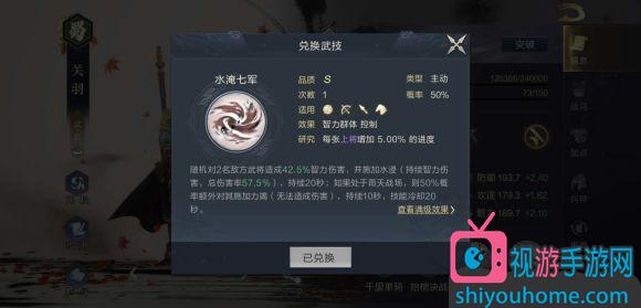 首先它是橙色S级技能,有于禁拆解获得,在获得上有一定难度,看技能效果,对两名敌方武将造成伤害,若处于缴械状态,则伤害提升30%,这和关羽的武技千里单骑完美的契合,可以说是最适合关羽学习的武技之一了。