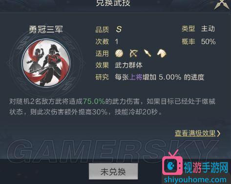 因为在前期攻打五级地等高级地时,通常都是采用爆头战术,所以关羽在武技的学习上也有研究。这里推荐的有:乘隙捣虚(颜良拆解)、擒龙缚虎(文丑拆解)、勇冠三军(于禁拆解)。这里着重讲解一下勇冠三军这个技能