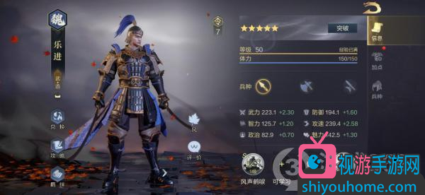 乐进在游戏中的武将定位为“武”、“迅”,所以比较适合组建成连击队。从满级后的各项属性来看,223.1的武力够得上武将中的一流水准,239.4的攻速附带2.58的成长,在整个游戏中都鲜有对手。因此可以看出,乐进的输出实力非常可观,加上其余各项属性都没有明显的短板,所以非常适合作为队伍的主力输出武将出场。