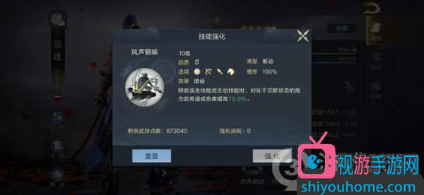 乐进的武将专属技能为“风声鹤唳”,效果为释放连击技能或主动技能时,对处于沉默状态的敌人伤害提高最多70%。因此,这个技能可以配合其他武将攻击的沉默效果使用,大幅提升乐进的输出能力。