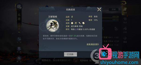 分解乐进后的兑换武技为“万军取将”,同样非常适合搭配沉默效果使用,进而对敌方造成更加强力的武力伤害。