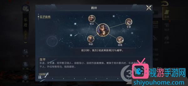 羁绊方面,乐进唯一的羁绊就是和张辽、徐晃、张郃、于禁组成的“五子良将”,效果为,在战斗前20秒,为我方两名武将提供20%的破甲。因此在武将阵容搭配时,因重点考虑从“五子良将”的羁绊中寻找武将,配合技能的沉默效果,打出高额爆发伤害。