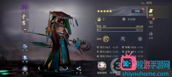 武力和防御是于吉的弱项,满级武力只有54.5,是武力值最低的群体之一。而满级防御也只有120.9,生存能力不强。