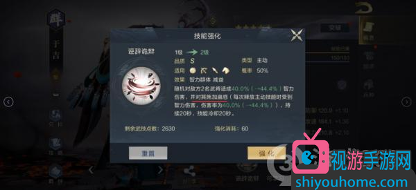 于吉的自带武技“诬辞诡辩”为主动技能,发动概率50%,随机对敌方2名武将造成智力伤害,并对其施加蛊惑,持续20秒。被蛊惑的目标每次释放主动技能,将受到智力伤害。对于缺乏解控并以主动技为主的队伍来说,“诬辞诡辩”可以让对方非常难受。