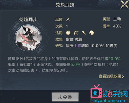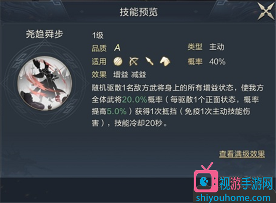 随机驱散1名敌方武将身.上的所有增益状态,使我方全体武将20.0%概率(每驱散1个正面状态,概率提高5.0% )获得1次抵挡( 免疫1次主动技能伤害),技能冷却20秒。
