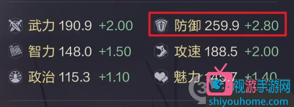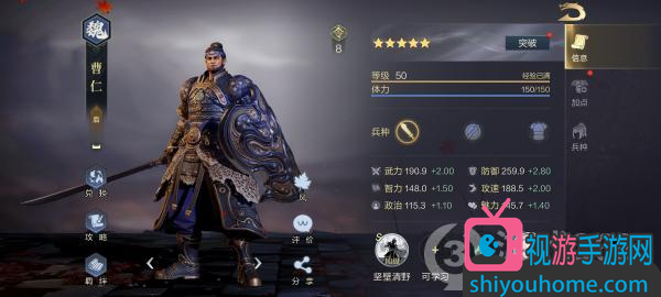 曹仁的定位是“盾”。属性以武力和防御见长,防御最高,满级时足有259.9。武力稍次,但满级时也有190.9。其他属性比较均衡,最低的政治,满级时也有115.3。