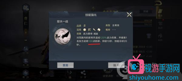曹仁的主将技是S级技能“背水一战”,可以对范围内的敌军共造成120%武力伤害,并提高1名友方武将100点防御属性,持续10秒。“背水一战”是一个伤害数值十分普通的技能,但提高友方武将100点防御,确实十分强大。