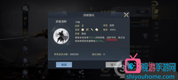 朴实无华的属性加成,看似普通,实则效果强劲。满级我方3名武将一共300点的防御加成,约等于再加入一个《鸿图之下》防御最高的满级武将作战。很明显,在当前的环境下,曹仁的“坚壁清野”是“盾”系武将诸多技能中,最为招牌的一个。