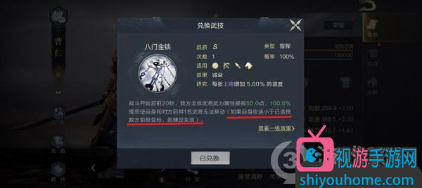 曹仁可以兑换的武技,是S级指挥技“八门金锁”。生效时,可以在战斗开始前20秒,让我方全体武将武力属性提高50点,100%概率使技能携带者自身和对方前排1名武将无法移动。虽然缚足效果十分强大,但如果技能携带者自身攻速小于已选择敌方前排目标,缚足特效就会消失。