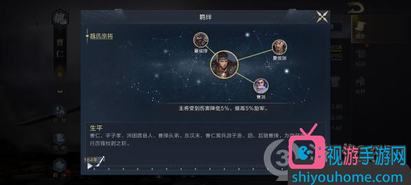 羁绊方面,曹仁可以与夏侯惇、夏侯渊和曹洪组成“魏氏宗将”,使我方主将受到伤害降低5%,并同时提高5%励军属性,增加主将的防御能力。