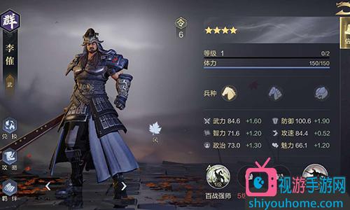 李傕在鸿图之下这款游戏中的星级设定是四星级,阵营设定是群,兵种设定是骑兵。李傕的武力、防御、攻速较高,其他属性则略逊一筹,但也不是很差,总的来说还可以,对没有五星将的平民来说不错了。