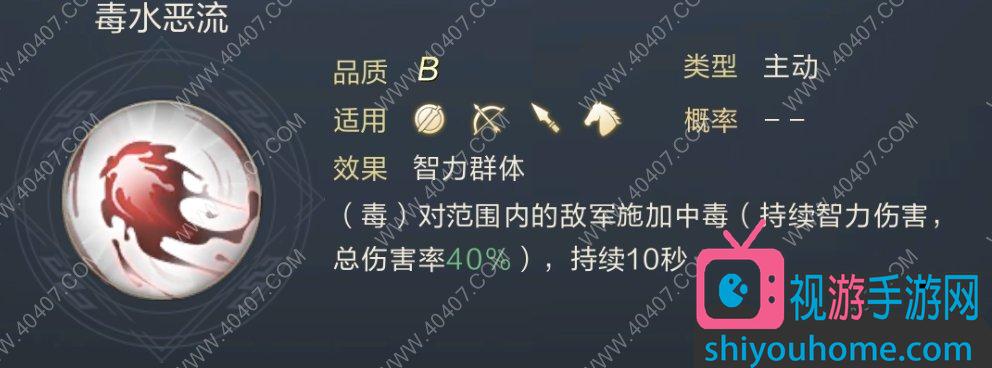 (毒)对范围内的敌军施加中毒,持续10秒。这是一个智力群体伤害,施加中毒的buff,不过伤害太低了,遇到防御高的人物就凉凉了。