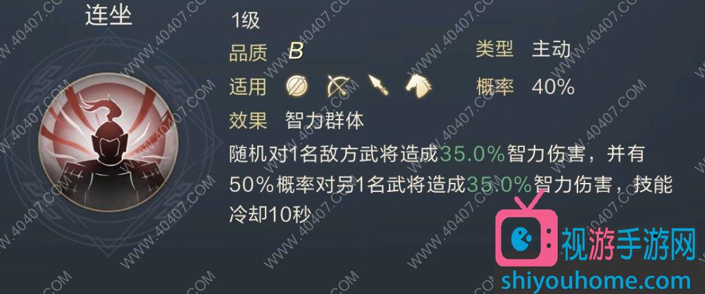 随机对1名敌方武将造成35%智力伤害,并有50%概率对另一名武将造成35%智力伤害,技能冷却10s。还是一个智力群上技能,概率也是比较高的。