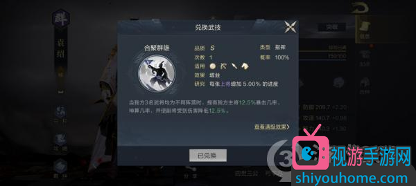 袁绍可兑换的武技为S级武技“合聚群雄”,指挥技能,当我方3名武将均为不同阵营时,提高我方主将12.5%(满级25%)暴击几率、神算几率,并使副将受到伤害降低12.5%(满级25%)。不同阵营武将进行组队,可以考虑装备这一武技。