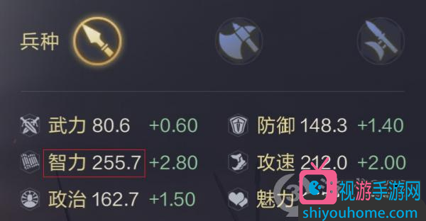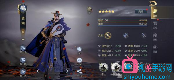 贾诩的武将定位是“智”,数值以智力最为突出,满级后达到了255.7。他的防御、攻速、政治和魅力数值也都不低,处于中等偏上水平。贾诩最低的属性是武力,仅有80.6。