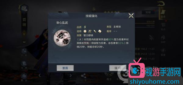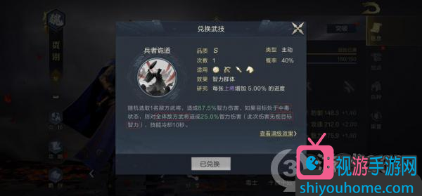 贾诩可以兑换的技能,是S级主动技能“兵者诡道”,发动概率是40%。满级后,释放者会随机选取1名敌方武将,造成175%智力伤害,如果目标处于中毒状态,则会对敌方全体武将造成50%智力伤害(此次伤害无视对方智力),技能冷却10秒。