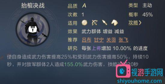 A级战法,拆解庞德获得,主动武力必备战法之一,155%双体伤害,并给自己施加一个25%的武力伤害提升BUFF,45%判定;