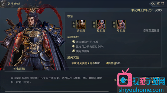 副将枪校尉用的也是三千兵力的枪兵,最后一个弓校尉用的是三千兵力的弓兵。玩家们通过关卡之后可以获得一千二铜币和六百预备役。我们通关兵力最少要八千,不然会打的比较费劲,如果你没有达到还是先提升一下比较好哦,
