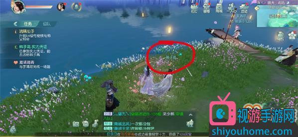5.在游戏的白天前往还梦渡口,在我标的圈圈附近会有发光的白色鹅毛一样的东西,点探查!然后会出现选项,选等到中午,芦苇气管就到手啦!