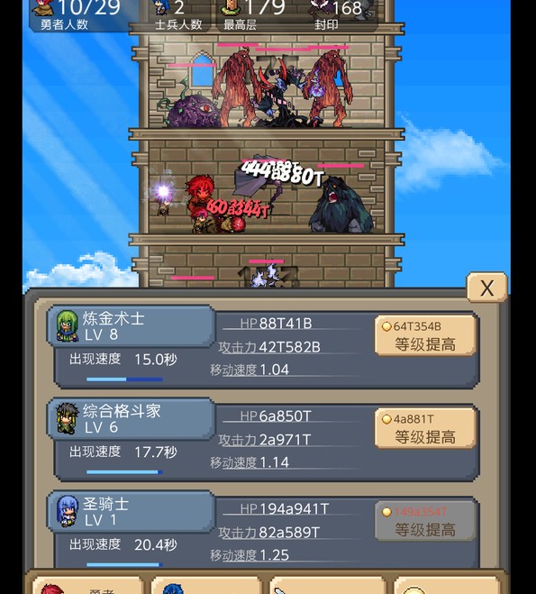 勇士之塔是一个角色扮演h5游戏,结合了突破和升级,不断升级你的士兵,增强你的战斗能力,提高你的装备属性和突破许多障碍。勇士之塔是一个放松和清新的像素h5游戏;战士爬上战争的塔,升级战士也可以召集特殊的伙伴!也有丰富的设备和华丽的技能来帮助你一路斩魔!游戏拥有完整的成就系统,完成成就之后可以获得钻石!大魔王我要杀了你!游戏拥有100个勇士任你差遣,永远不会玩厌,值得注意的是,在玩家一道道关卡闯玩时,一定要及时升级你的装备,好来应付之后的BOSS,游戏中的小兵,boss都可以随时复活的,玩家一定要打起精神防御!喜欢本类作品的玩家,快来玩吧!